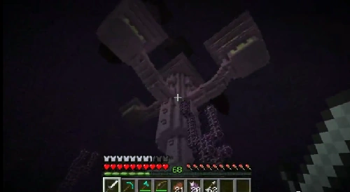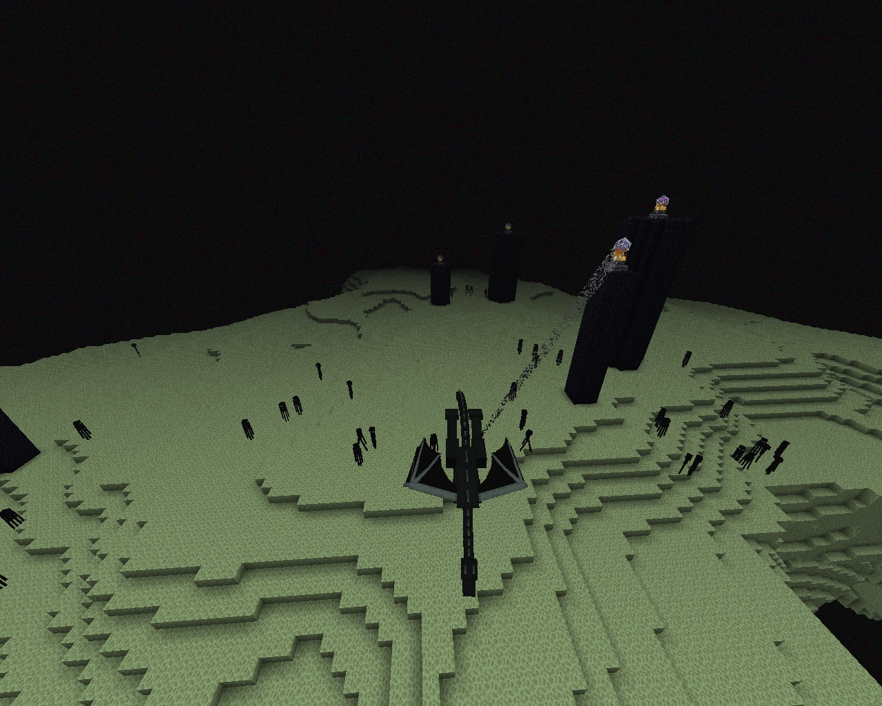 The outer End is another part of the End, one thousand blocks away from the central island, with the main feature being one or more end cities. One can get there by killing the Ender Dragon and then tossing an Ender pearl through the one-block portal that appears in the sky, or through traveling the one thousand blocks. The outer End has many islands and like the end, they are surrounded by the void. Chorus plants are the only vegetation native to this zone. Endermen and shulkers are common mobs within an End city. An End city area can have several different types of tower-shaped structures and an end ship, each filled with loot. These cities are made of purpur blocks and End stone bricks, which are exclusive to this zone.