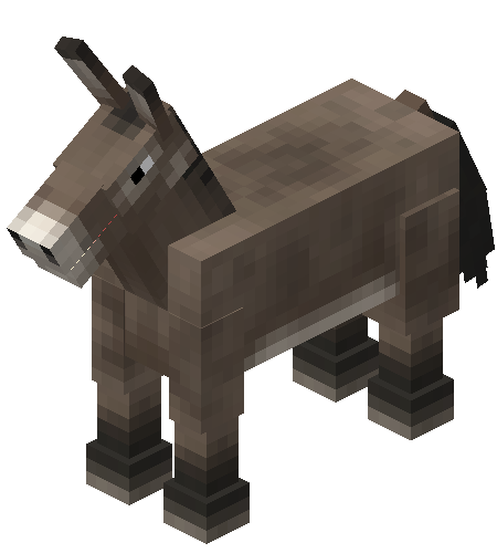 Donkeys are gray, long-eared mobs similar to horses that can be found in the wild or by using a donkey spawn egg (horse spawn egg as of the TU38 update for Console Edition).